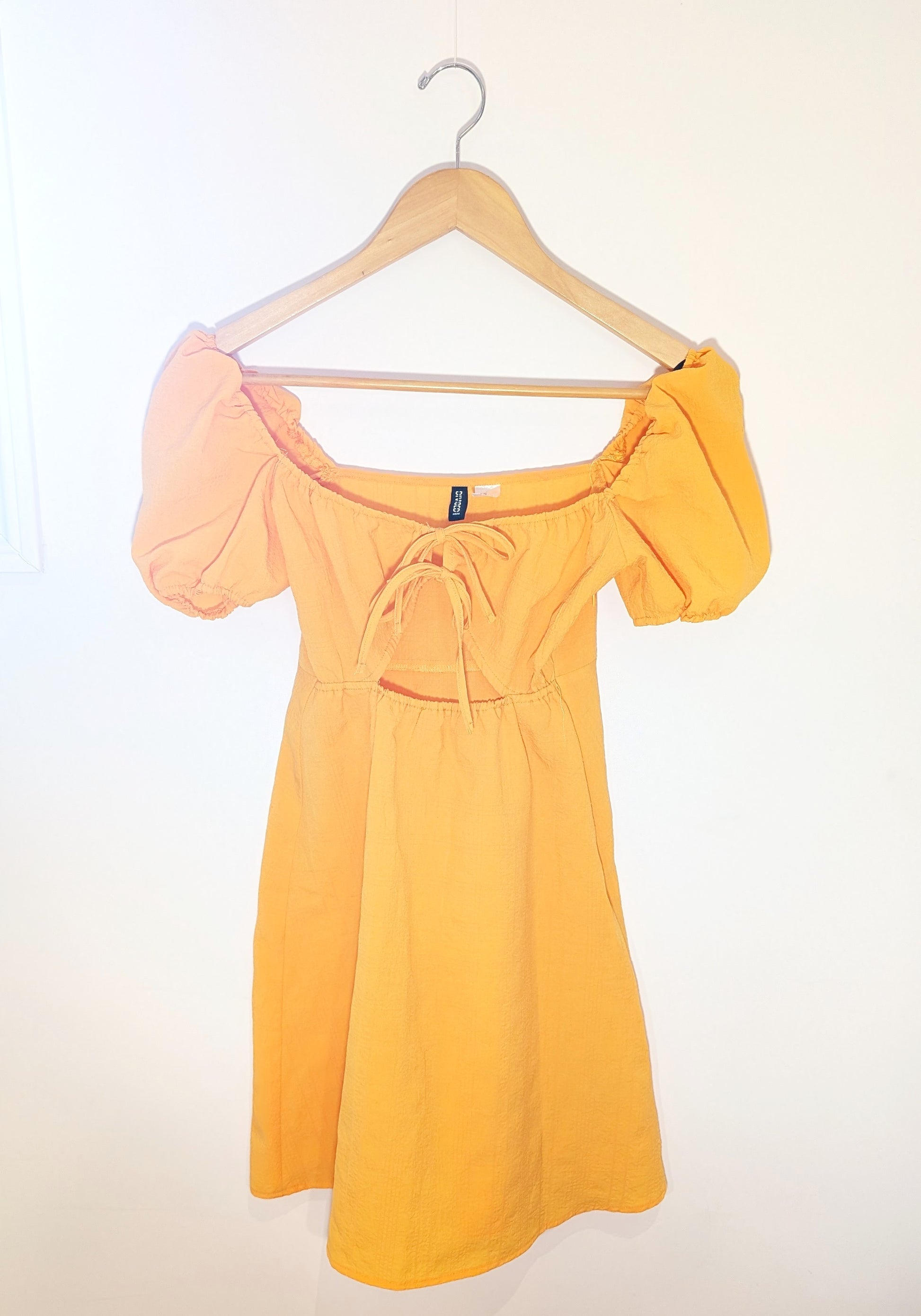 Cette robe courte estivale combine coton et polyester, agrémentée de manches et d'une jupe ample et volumineuse.